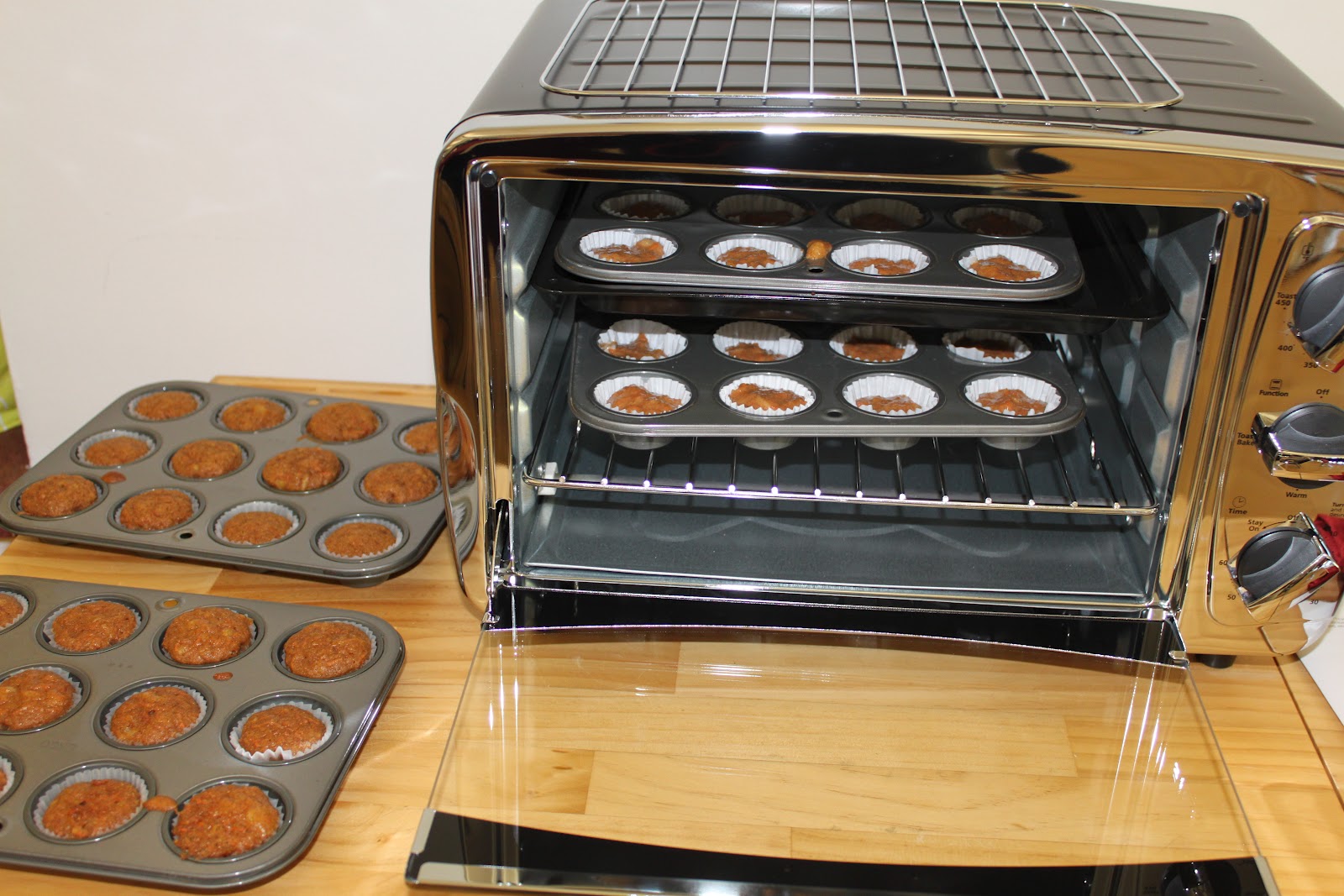 So, a little blessing in disguise, was that I got this table top oven. It has 2 baking racks and holds 24 mini muffin/cupcakes at a time. I’d say that’s Perfection for Kids Kitchen and all these kids that request muffins and baked goods.